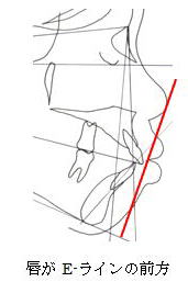 E-ラインはアメリカの矯正家Dr.Richetts が考案したもので、顔貌と唇の関係を調べるためのものです。Dr.Richettsによると綺麗な側貌では下唇がE-ラインより2mm後方で、上唇は4mm後方に位置しています。